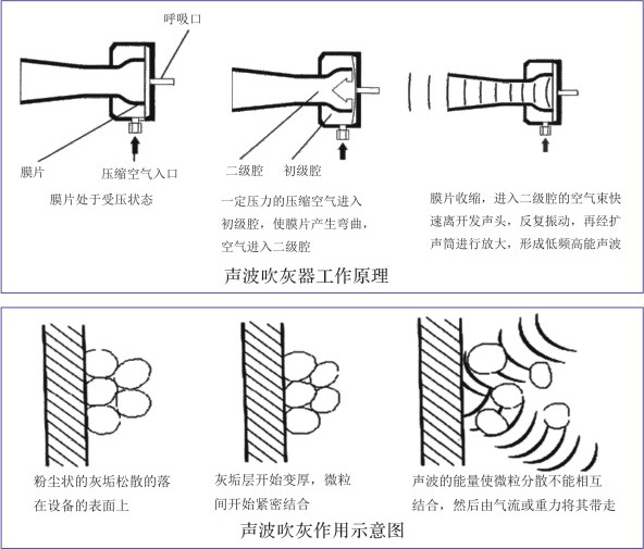 聲波吹灰器以壓縮空氣為動(dòng)力源,膜片在發(fā)聲器諧振腔體內(nèi)振動(dòng),產(chǎn)生特定低頻、高能量聲波,通過擴(kuò)聲筒在被清設(shè)備空氣中諧振傳播,用于結(jié)灰體表面的積灰,使其產(chǎn)生致疲勞而剝落,達(dá)到清除積灰的目的。